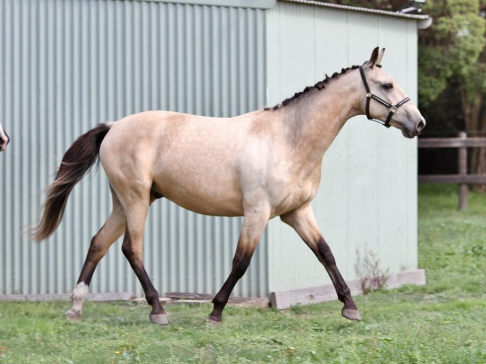 Day Dream is a very sweet natured 3 yo gelding already 16 hh by Daiquiri Gf . His Dam is Coldstream Caprice dam sire Farrington KWPN ifs. Day Dream is lightly started under saddle a few months ago and has been turned out to grow. He was easy to ride and has been safe to walk trot and canter out around the farm and is ready to go to someone capable of bringing on a talented young horse. He should succeed in any chosen sport be it Dressage , Jumping or Eventing and is pretty enough to Show. Registered warmblood and is eligible for buckskin colour reg.